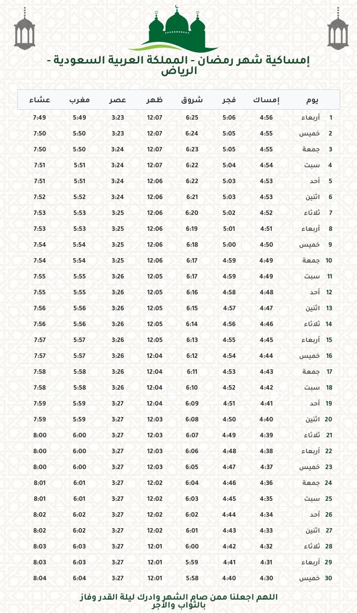 إمساكية رمضان 2026 الرياض