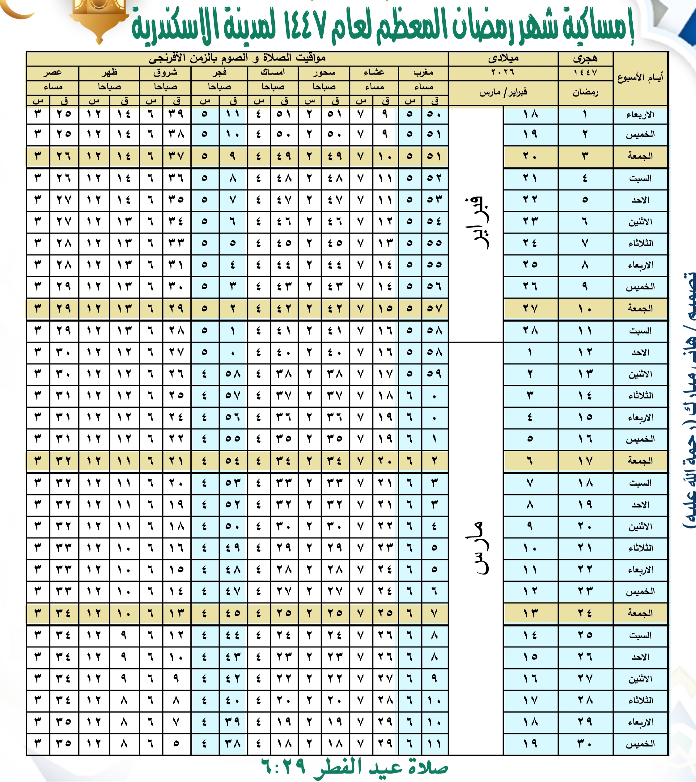 امساكية رمضان 2026 في الاسكندرية لها طابع مختلف يشبه روح المدينة نفسها، حيث مدينة البحر والهواء والكورنيش الممتد الذي يتغير إيقاعه تماما مع دخول الشهر الكريم، حيث أنه في هذا الشهر لا تكون مواقيت الصلاة مجرد أرقام في جدول، بل تتحول إلى محطات يومية ينتظرها الناس على صوت الأذان القادم من مآذن المساجد المنتشرة على طول الشوارع والأحياء الشعبية والراقية، حيث تصبح إمساكية رمضان 2026 في الإسكندرية أكثر من مجرد ورقة أو صورة على الهاتف، إنها هي خريطة زمنية للحياة خلال شهر مختلف تماما عن باقي شهور السنة.