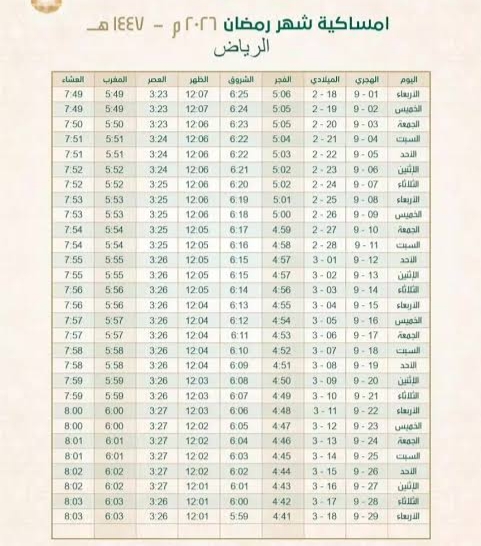 إمساكية رمضان 2026 في الرياض