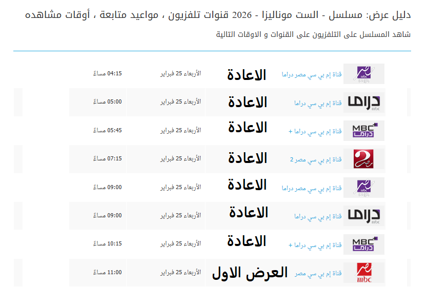 جهة العرض توقيت العرض (بتوقيت القاهرة)